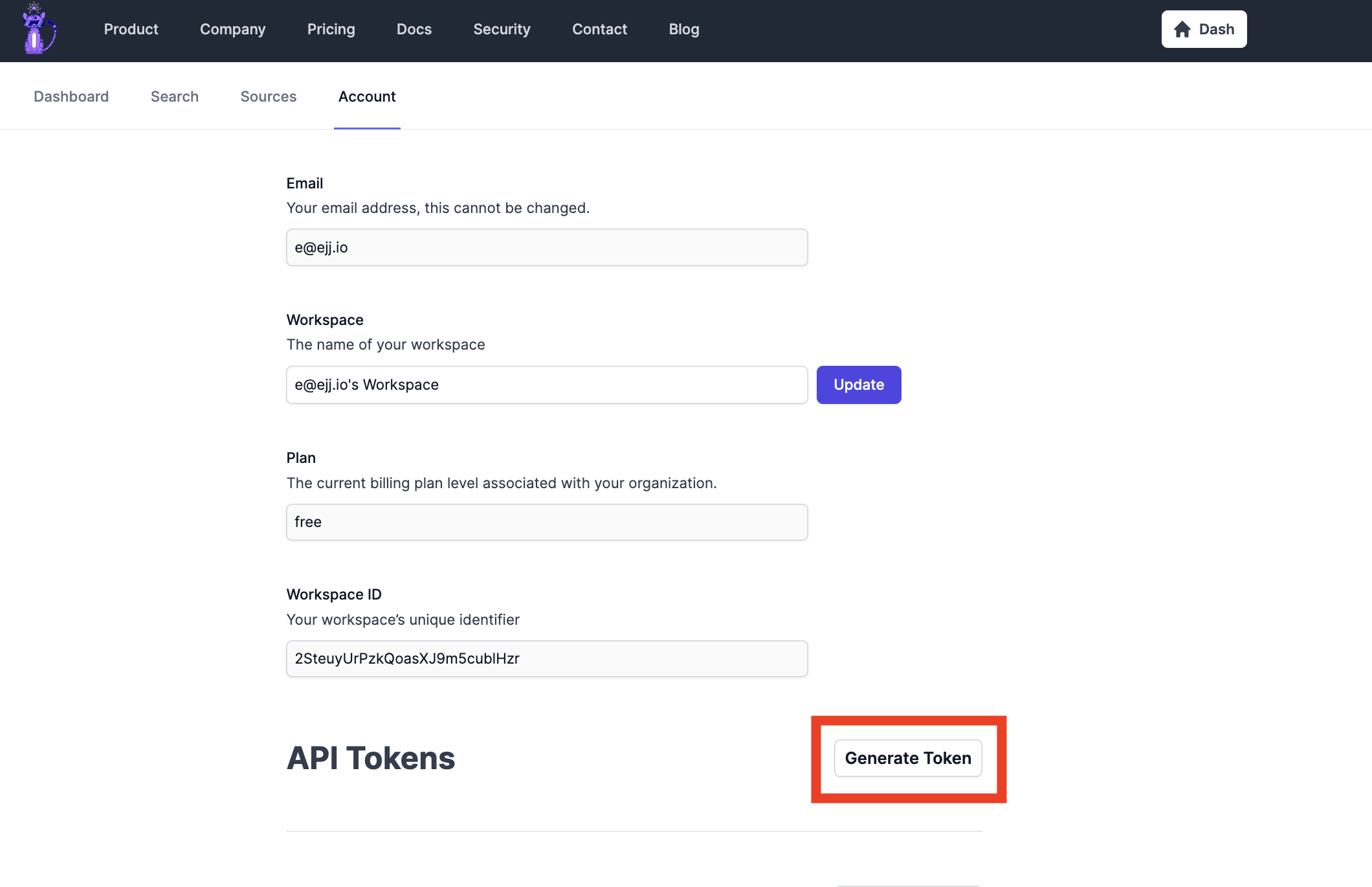 - Generate in the RunReveal UI. You can generate an API token under the the “Settings” panel. Click “Generate API Token” next to the API Tokens.