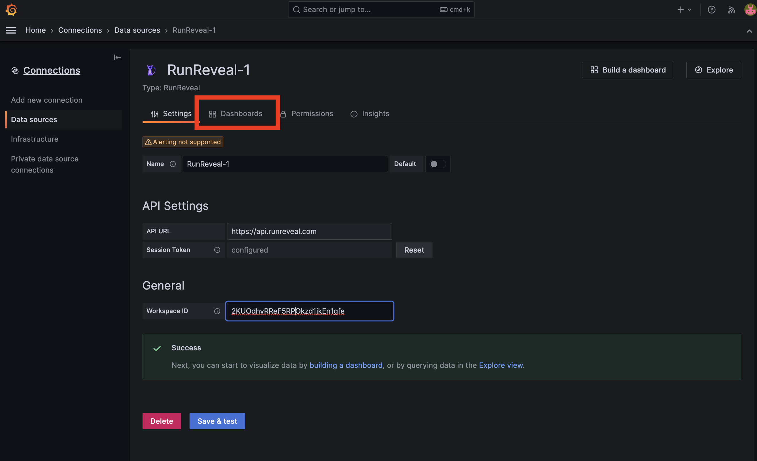 Paste the generated token into “Session Token” input field, along with the workspace ID from the settings page into the Workspace ID field, and press “Save & Test”.
