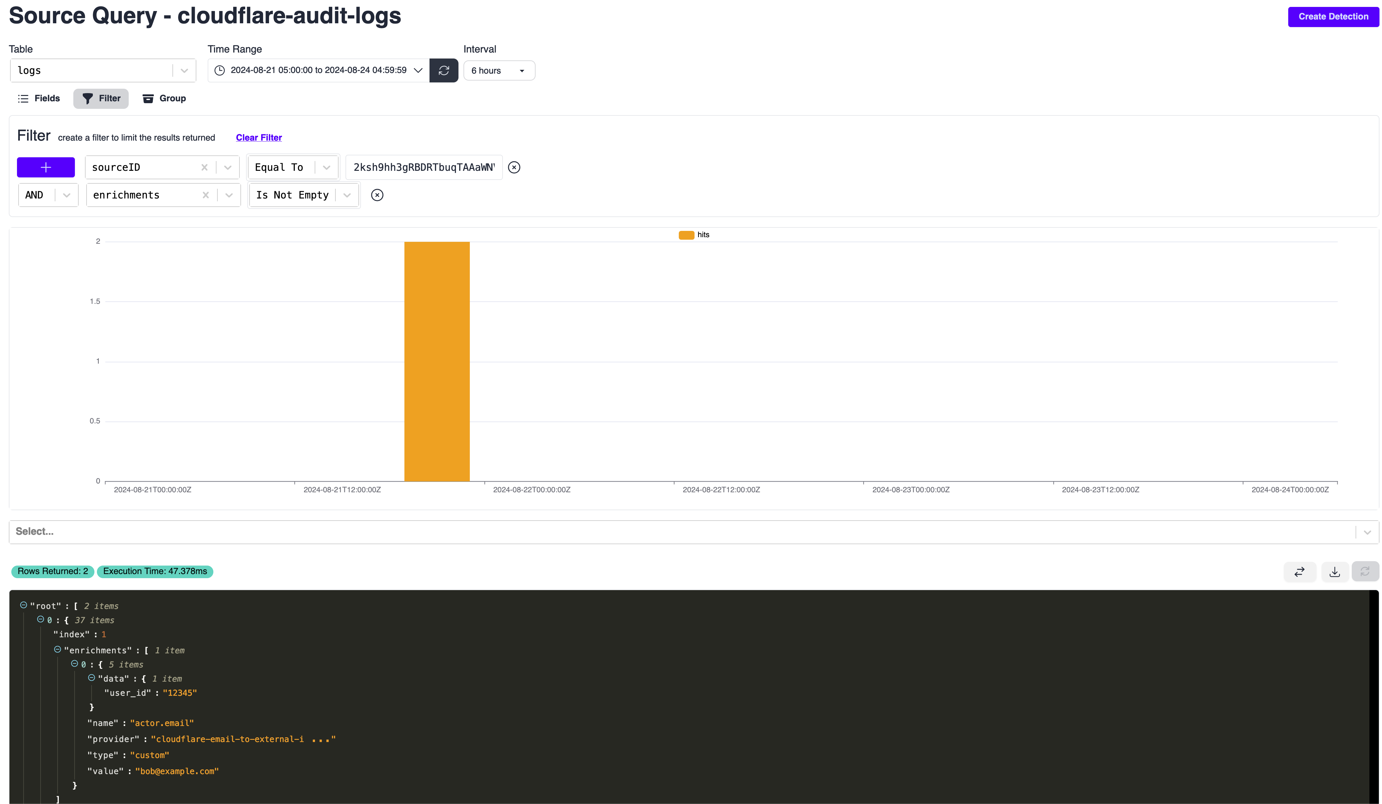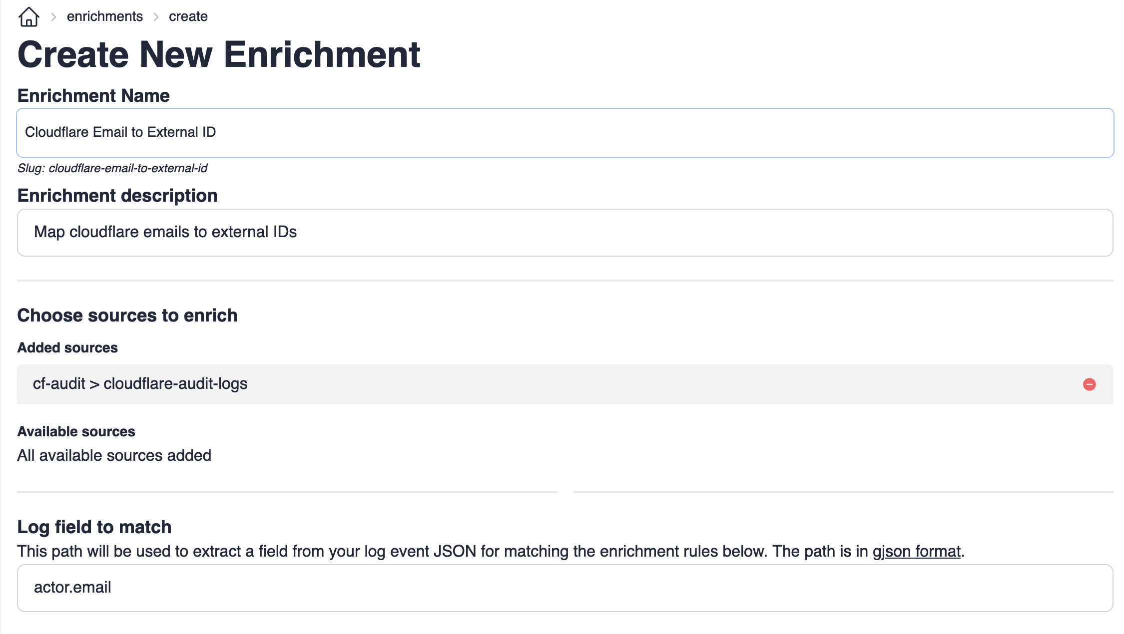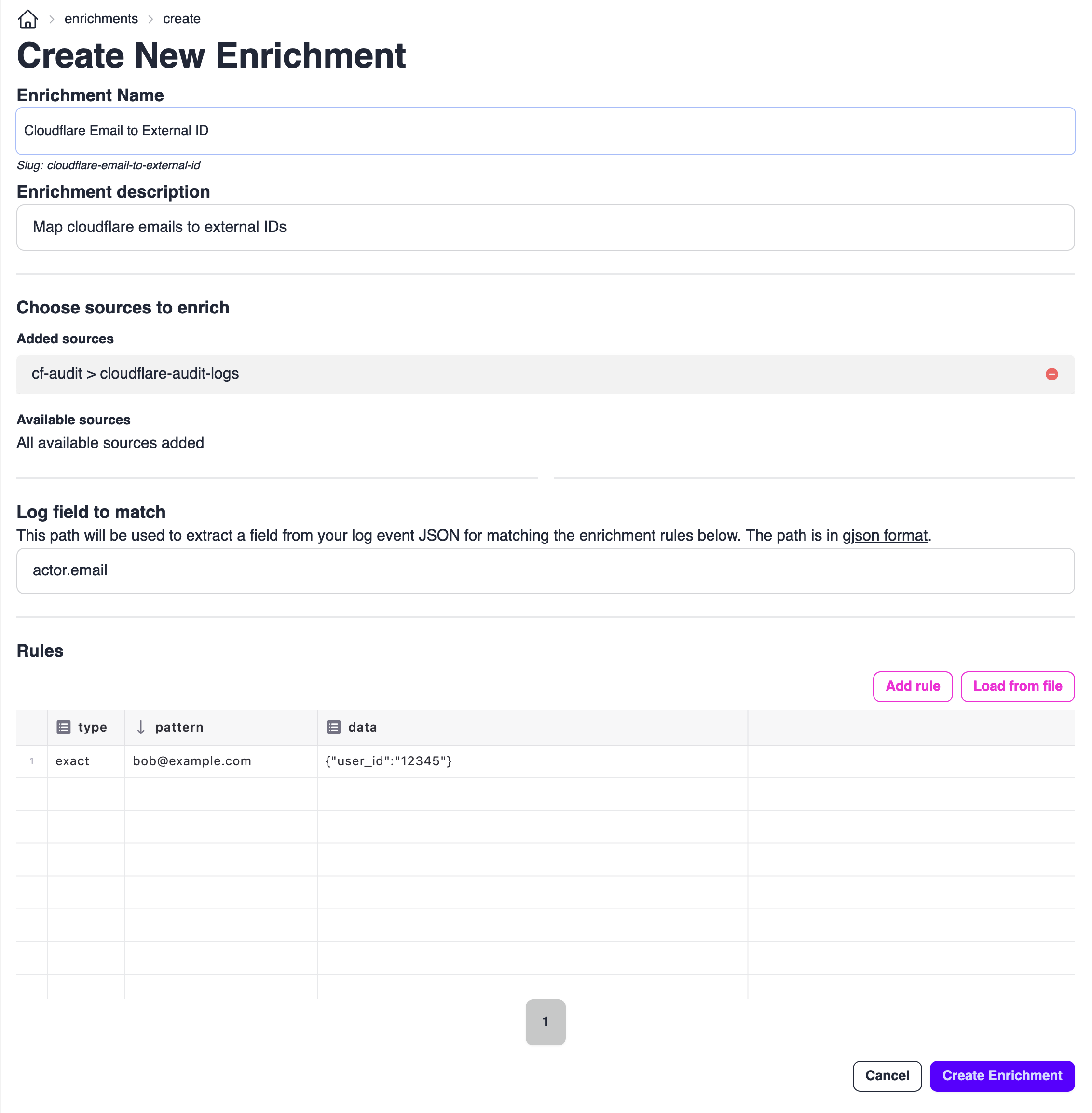 Let’s say you are wanting to enrich log events from your cloudflare audit log source, to map user emails to user id’s from some other external system you have.