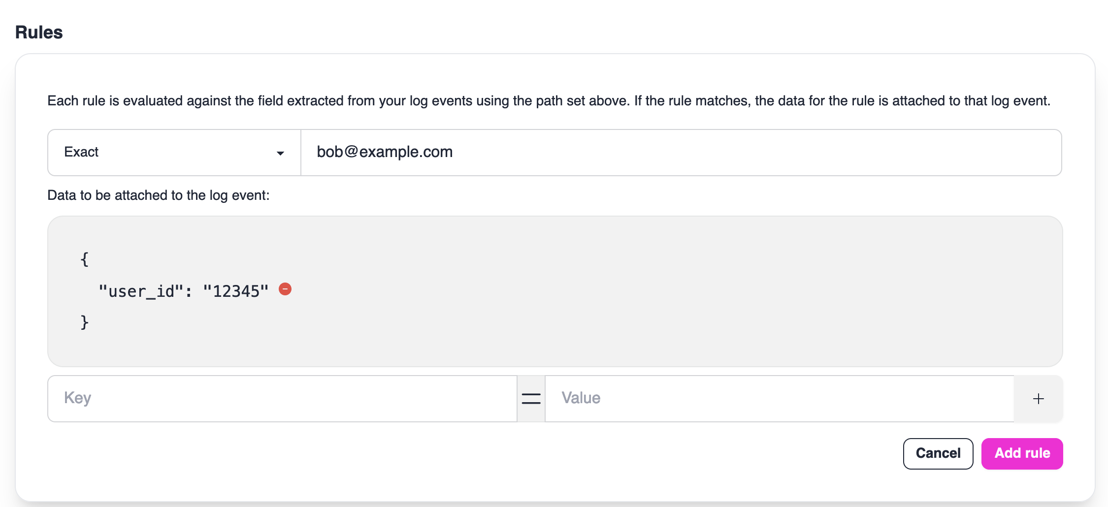 does match, then {"user_id": "12345"} will be added to the enrichments field of the log event before it is written to its destination.