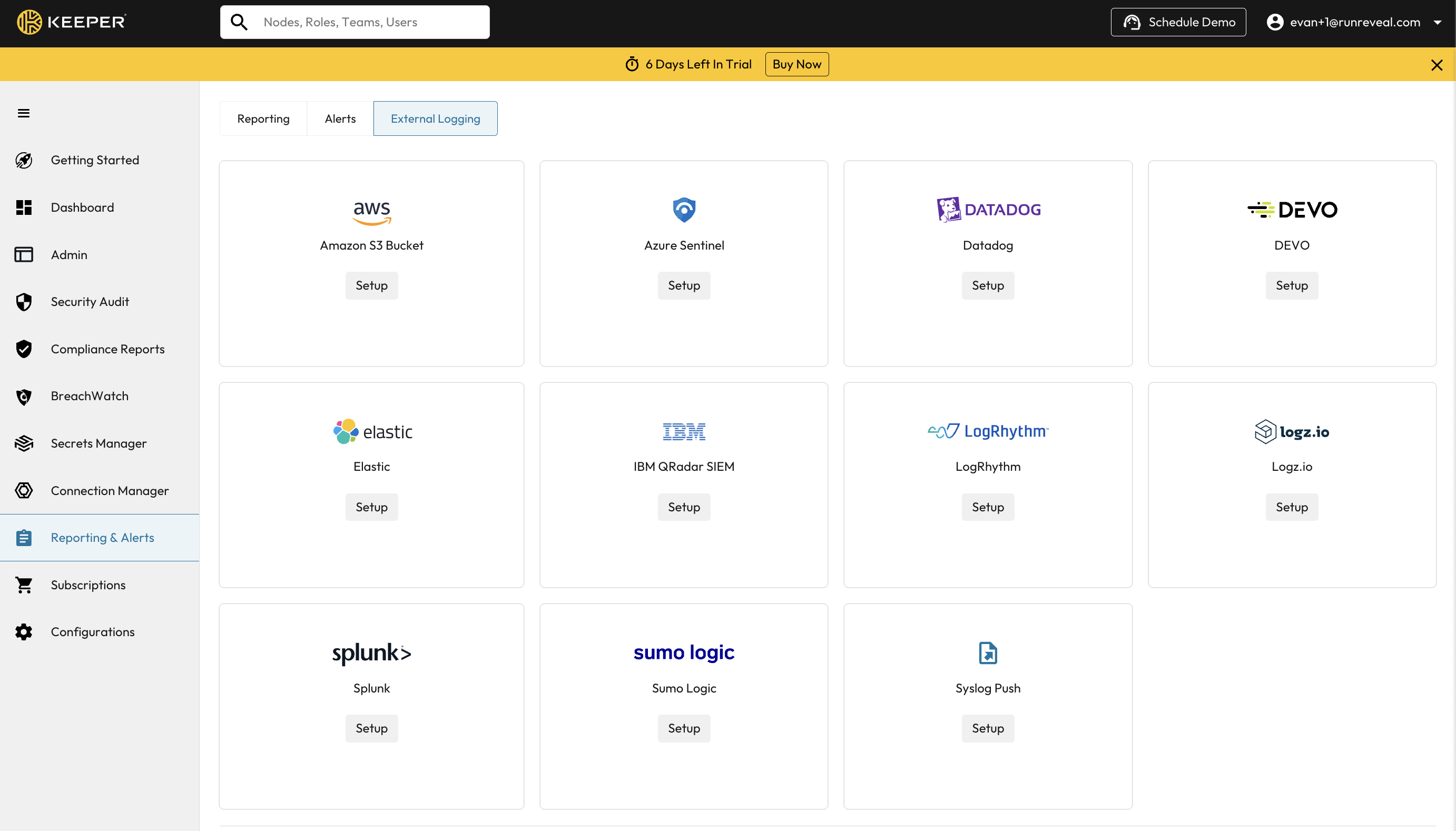 In the Keeper Security admin console navigate under “Reporting and Alerts” to “External Logging”. You should see list of suppoted SIEM integrations that Keeper natively supports.
